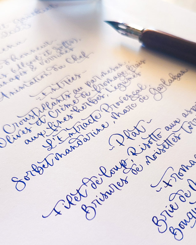 Chaque menu est calligraphié à la main, à la plume, sans impression ni reproduction numérique. Ce travail minutieux permet d’obtenir une écriture vivante, avec les légères variations propres à la calligraphie, ce qui fait précisément tout son charme par rapport à une impression classique.